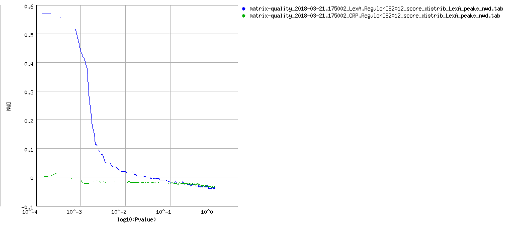 Command: matrix-quality -v 0 -html_title ' LexA and CTCF matrices from RegulonDB 2015 ' -ms $RSAT/public_html/tmp/apache/2018/03/21/matrix-quality_2018-03-21.175002_zdBRpm/input_matrix -matrix_format transfac -pseudo 1 -seq LexA_peaks $RSAT/public_html/tmp/apache/2018/03/21/matrix-quality_2018-03-21.175002_zdBRpm/sequence1.fasta -seq_format fasta -plot LexA_peaks nwd -seq CRP_binding_sites $RSAT/public_html/tmp/apache/2018/03/21/matrix-quality_2018-03-21.175002_zdBRpm/sequence2.fasta -plot CRP_binding_sites nwd -perm LexA_peaks 1 -perm CRP_binding_sites 1 -bgfile $RSAT/public_html/data/genomes/Escherichia_coli_GCF_000005845.2_ASM584v2/oligo-frequencies/2nt_upstream-noorf_Escherichia_coli_GCF_000005845.2_ASM584v2-ovlp-1str.freq.gz -bg_format oligo-analysis -bg_pseudo 0.01 -archive -o $RSAT/public_html/tmp/apache/2018/03/21/matrix-quality_2018-03-21.175002_zdBRpm/matrix-quality_2018-03-21.175002