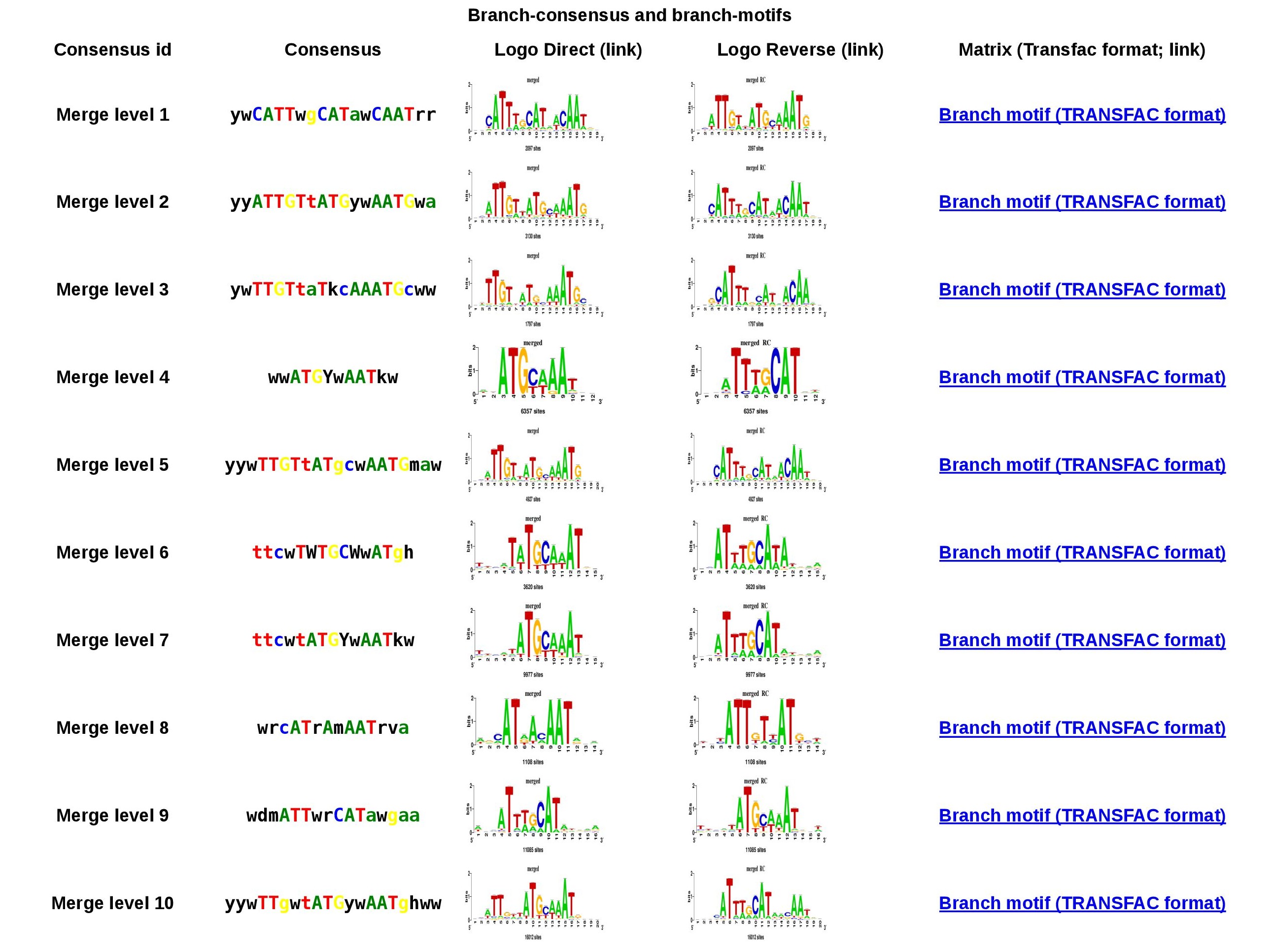 Figure 4. Branch-motif table for cluster 1. You can download the motif in TRANSFAC format or the logo in both orientations by clicking on them.