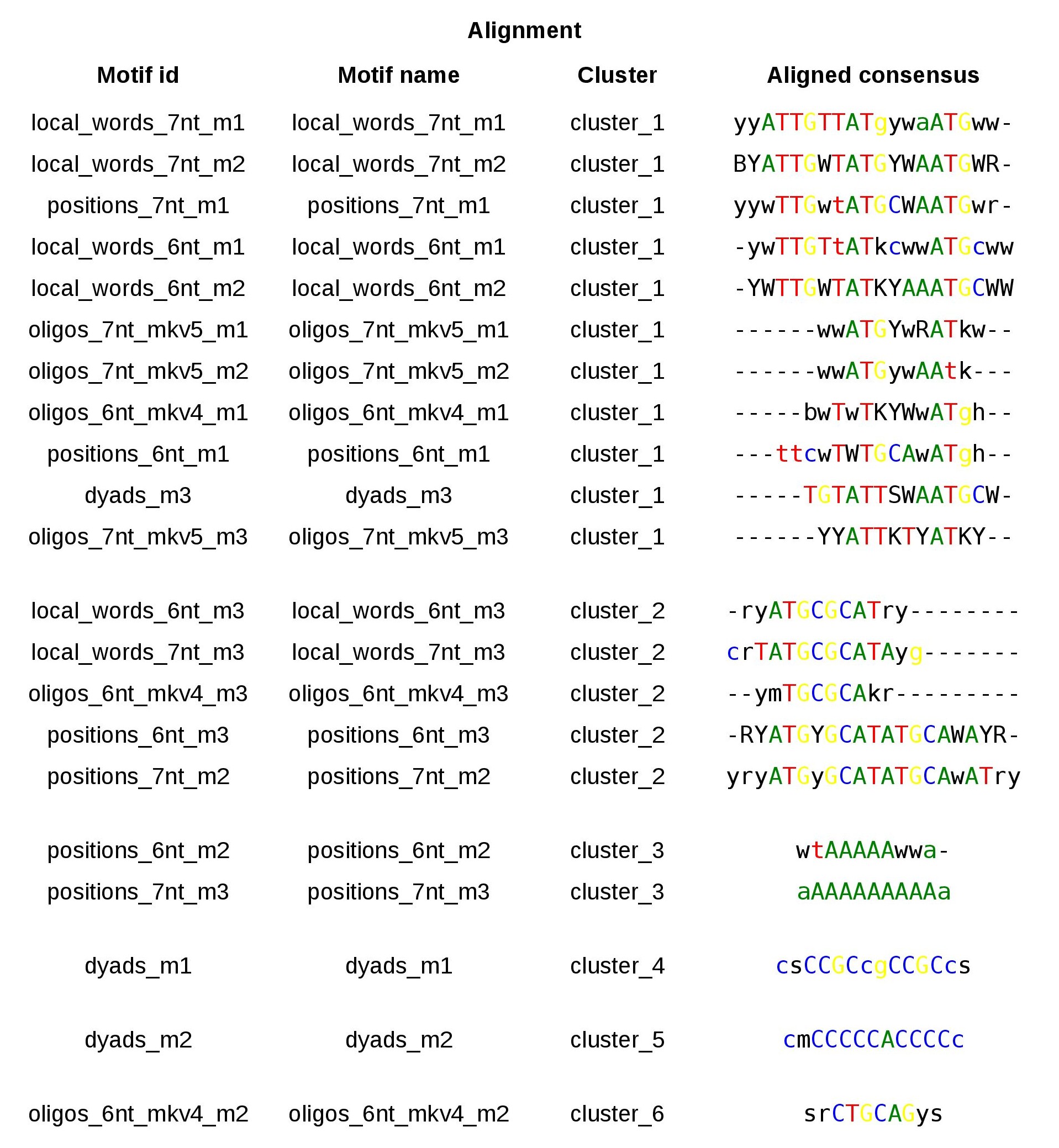 Figure 9. Summary table of an example of matrix-clustering results with randomized motifs