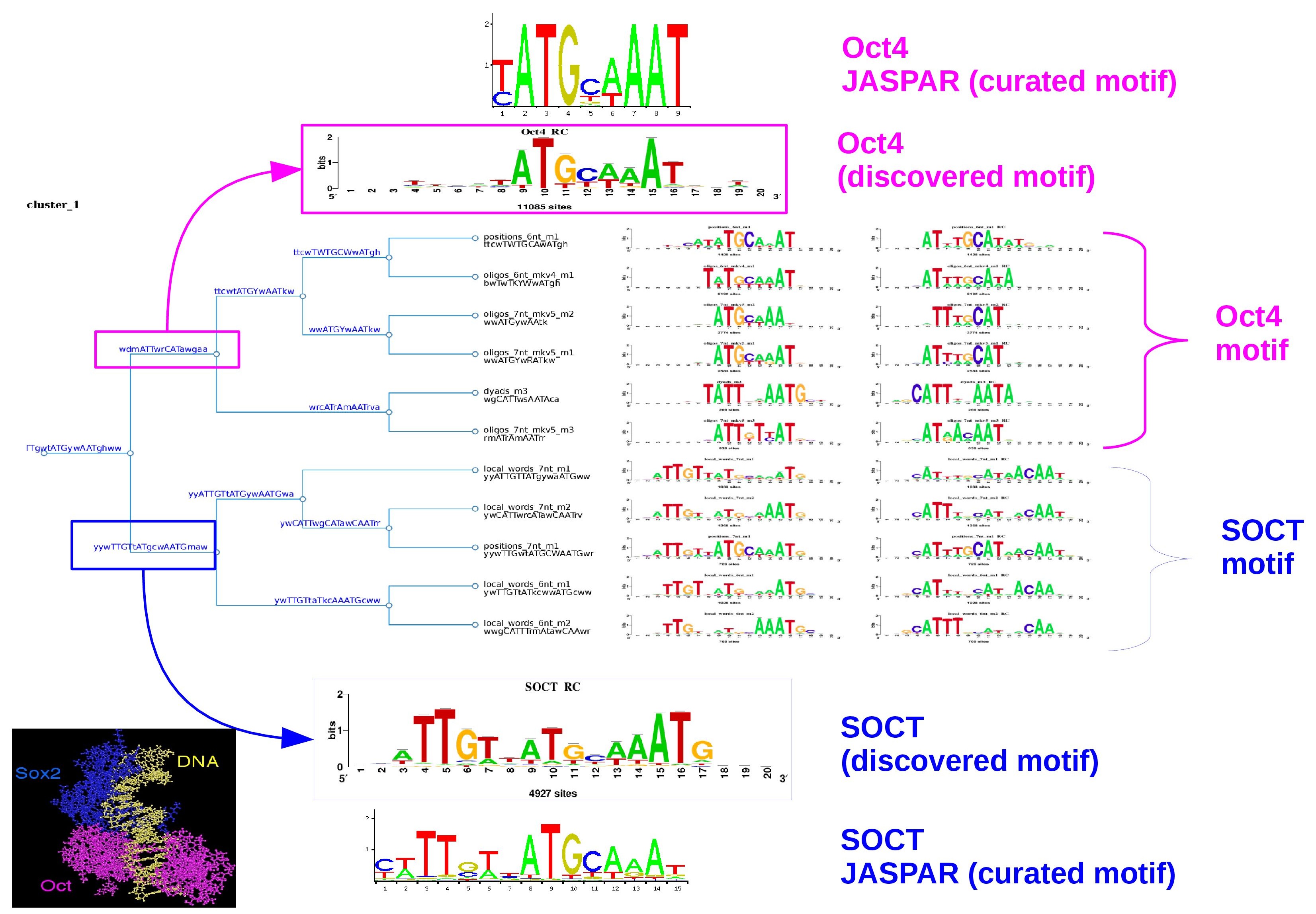 During the analysis of Oct4 or Sox2 binding peaks, the so-called SOCT motif is usually found, which is a composite motif encompassing both Oct and Sox motifs. (Figure 1)