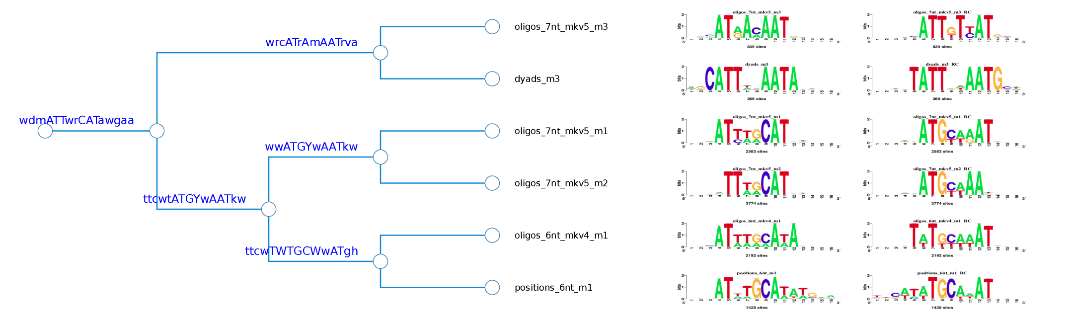 Figure 3. Logo tree of the cluster 1 found in the Oct4 ChIP-seq motifs. The hierarchical tree displays the logo aligment in both orientations. For each branch is calculated a branchwise-motif.