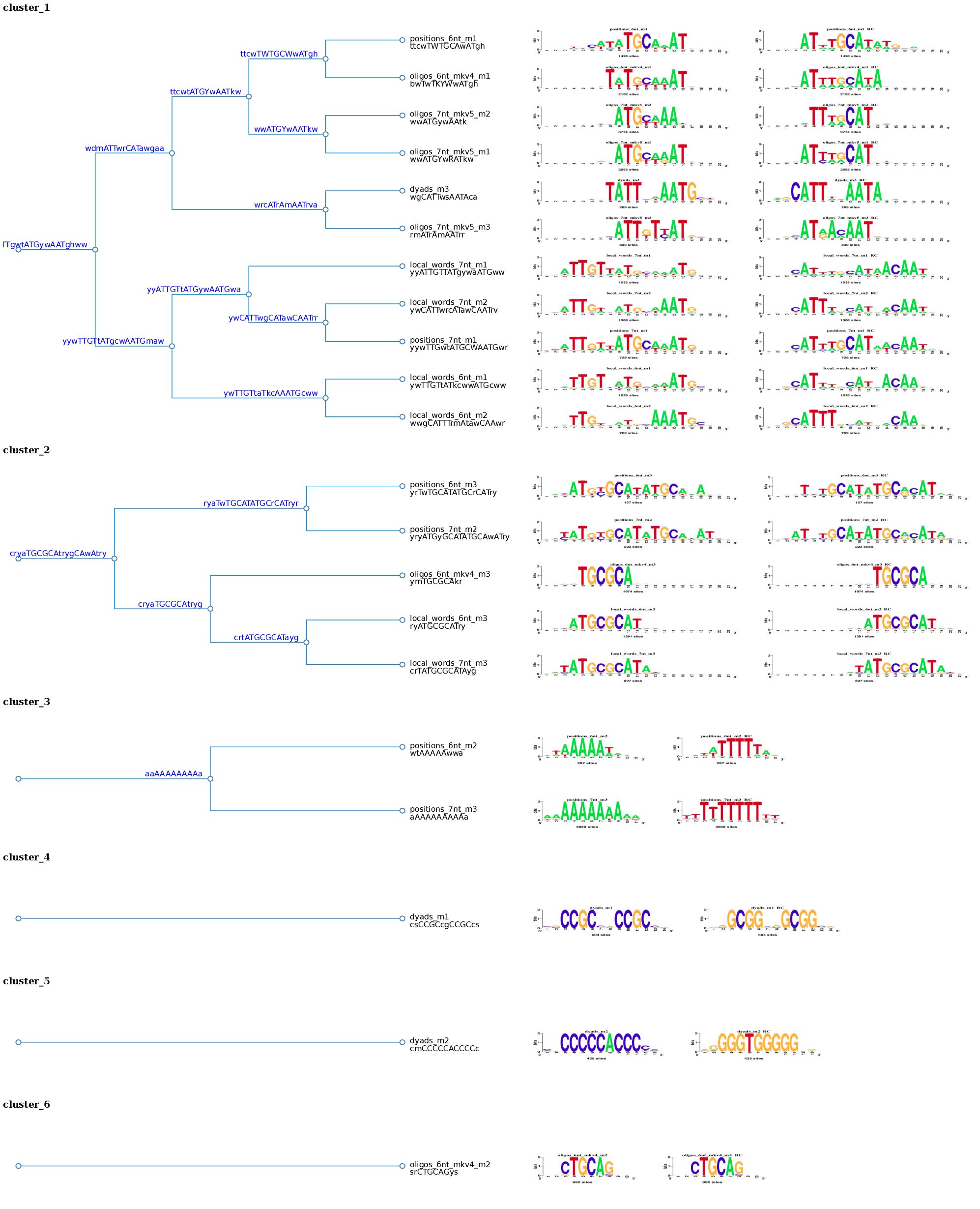 Figure 5. Logo Forest with the 21 motifs discovered by peak-motifs in the Oct4 ChIP-seq peaks. Using a combination of values as threshold (cor = 0.6; Ncor = 0.4) these motif were separated in 6 different clusters and each one is displayed in a tree.