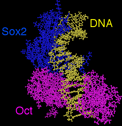 Figure 1. 3D model showing the cooperative binding between Sox2 and Oct4 TFs whose closely interact to bind DNA. Together, they recognize a composite motif called the SOCT motif (SOx+OCT).